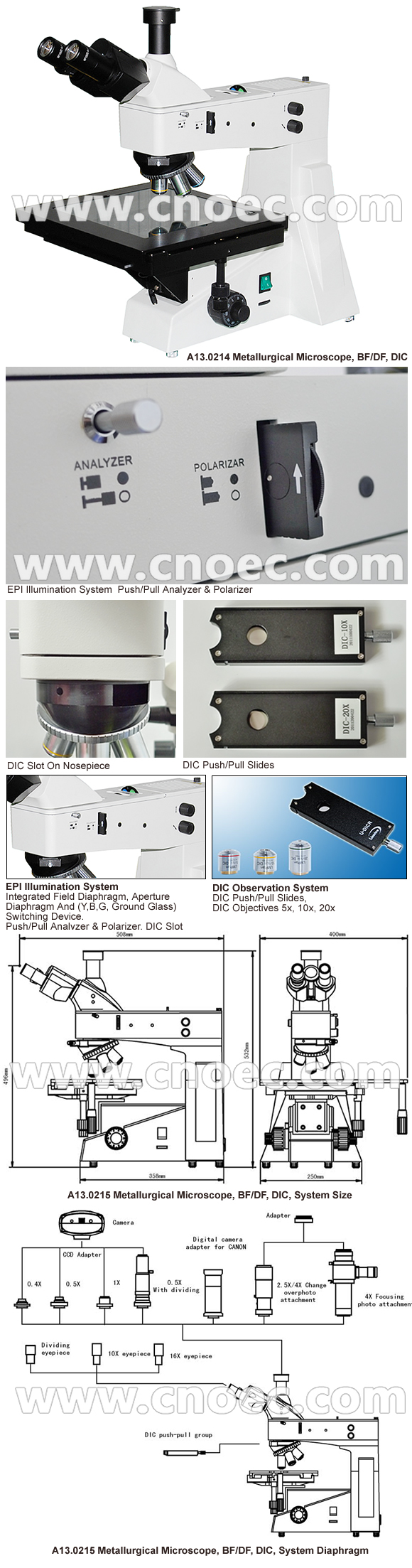 A13.0215 Differential Interference Contrast Microscope is suitable to observe many different kinds of object. It is equipped with transmitted illuminator and reflected DIC system, infinity plan achromatic objectives with long working distance, wide-field eyepieces and polarizer device. It provides clear and 3D image, beautiful sculpt, convenient control, etc. It is the ideal instruments in research work in biology, metallography, mineralogy, precision engineering, electronics, etc. Features