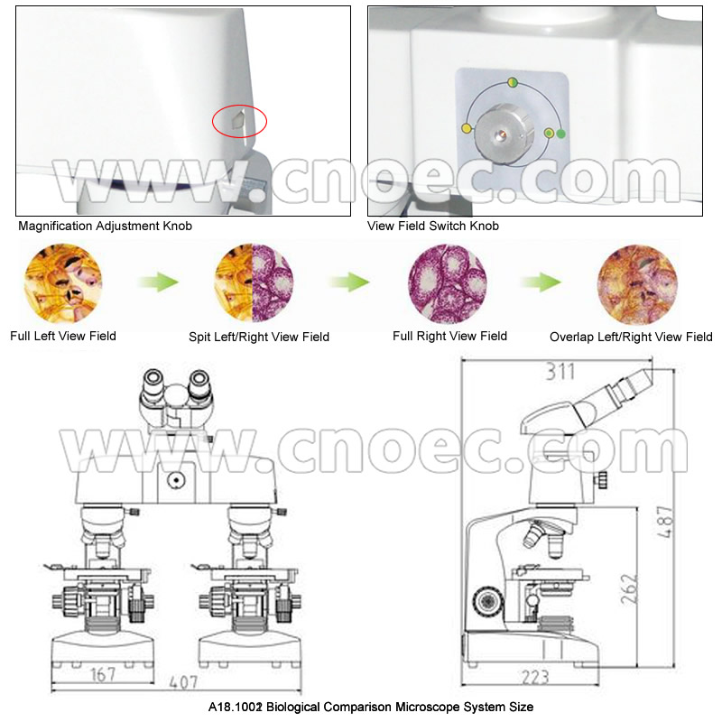 A18.1002 Biological Comparison Microscope, is used to analyze side-by-side specimens. It consists of two microscope connected to an optical bridge, which gives choice of 4 kinds observation view field: Full Left, Full Right, Split, and Overlapping Image. It is designed for identifying object's structure, comparing similarities and differences between specimens, such as pathological slides, biological slides and so on. It is an ideal instrument for teaching, biological and medical field